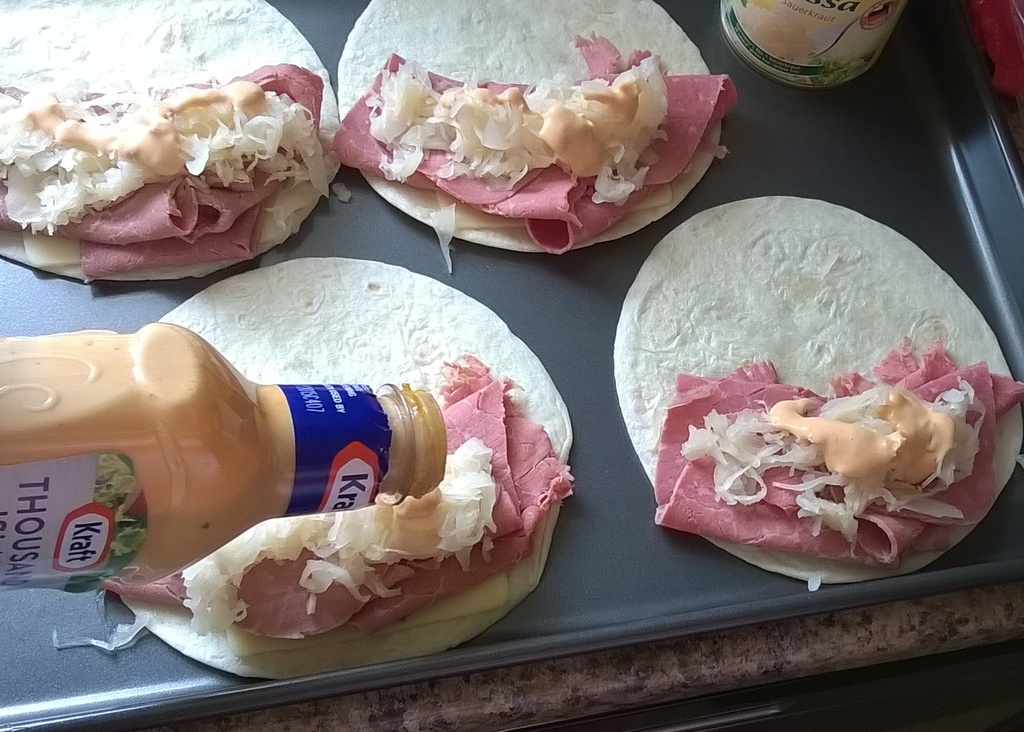 - Place corned beef on one side of tortillas, and top with Swiss cheese, sauerkraut and Thousand Island dressing.